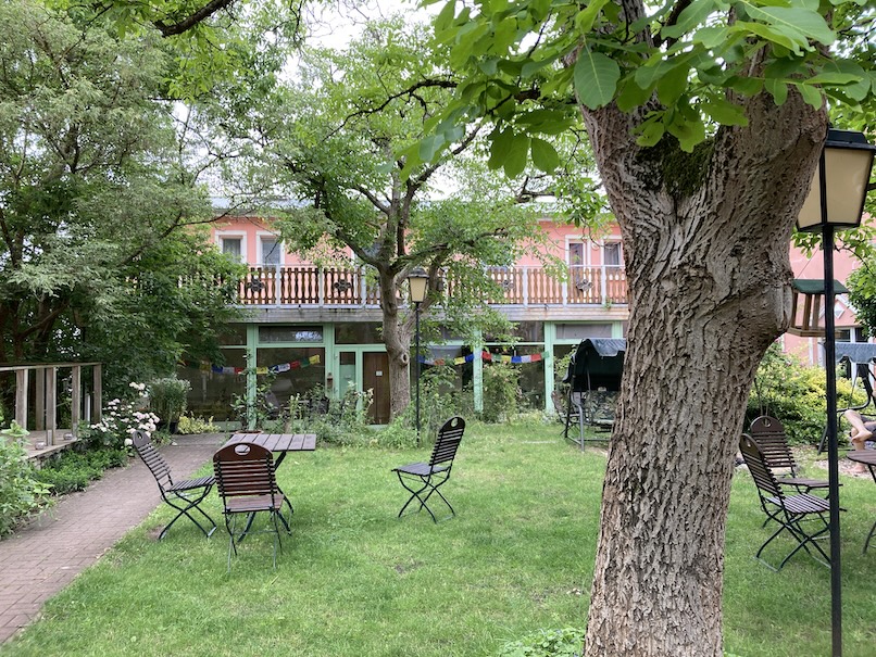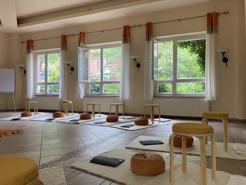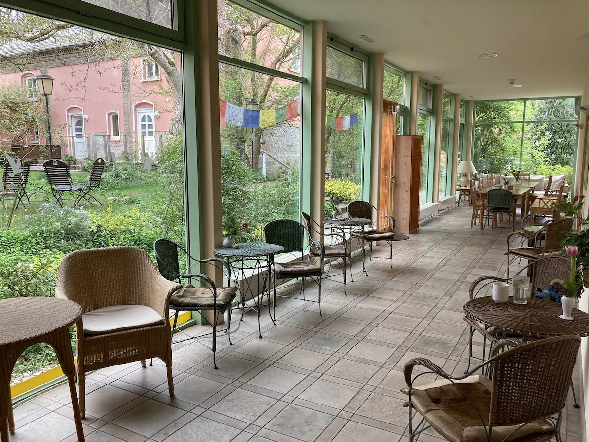 Herzstück des Hauses sind der schöne Wintergarten, wo wir die Mahlzeiten zu uns nehmen, und der malerische Garten im Innenhof. Direkt daneben liegt unser großzügiger, lichtdurchfluteter Seminarraum, der gleich zu zwei Seiten Blick nach draußen ins Grüne bietet. Sitzkissen, Hocker, Stühle, Decken, Kopfkissen und Yogamatten sind vorhanden.