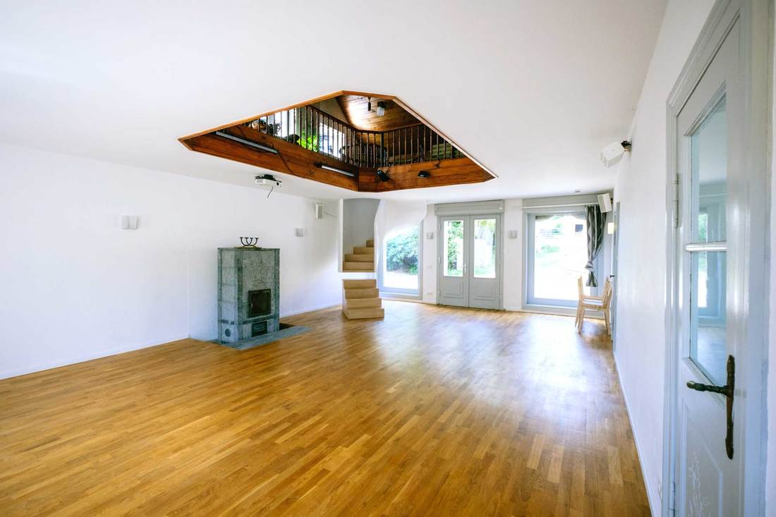 Der großzügige, lichtdurchflutete Seminarraum ist mit Parkettboden und Fußbodenheizung ausgestattet. Besondere Eyecatcher im Raum sind eine elegante Freitreppe und die Öffnung der Decke zum Obergeschoss hin. Sitzkissen, Stühle, Decken und Yogamatten sind vorhanden.